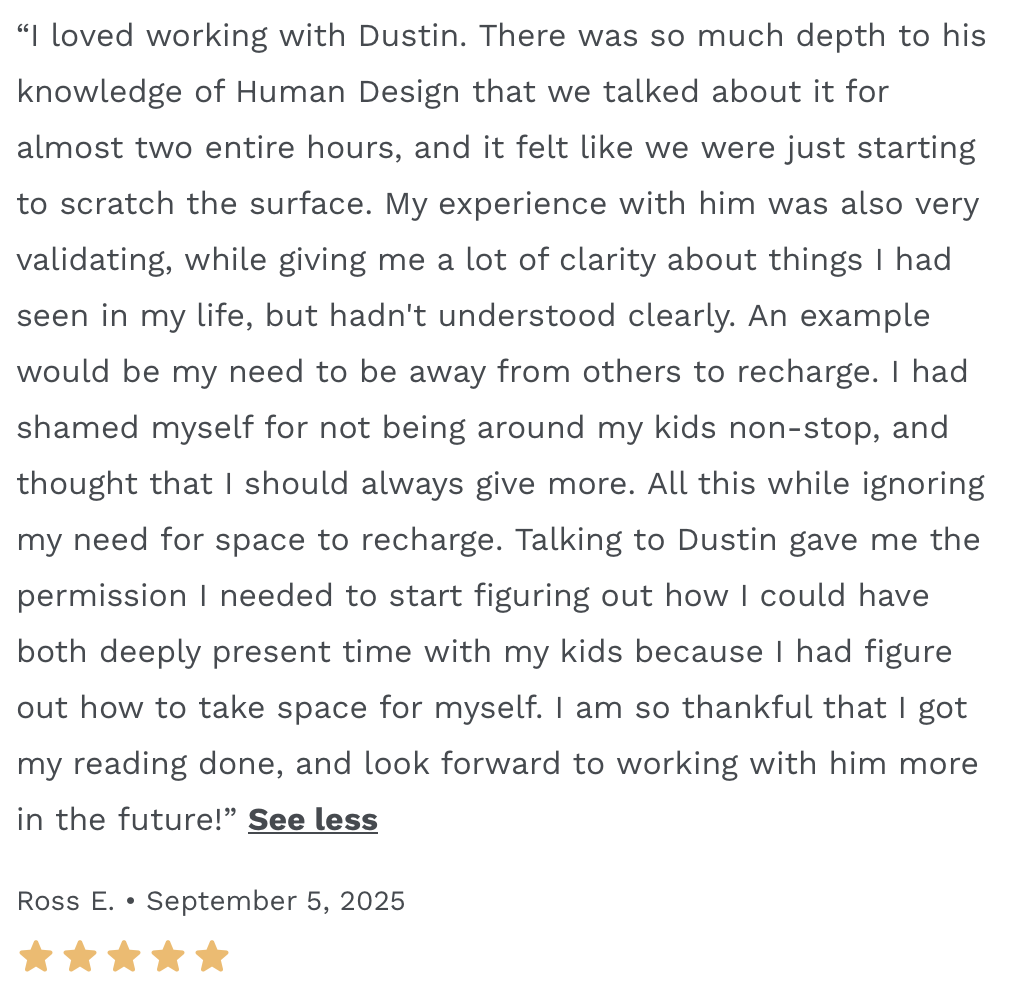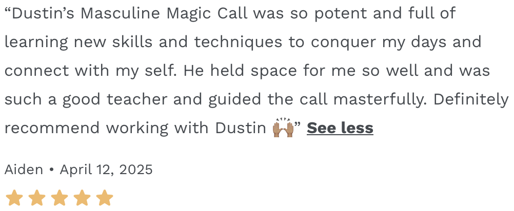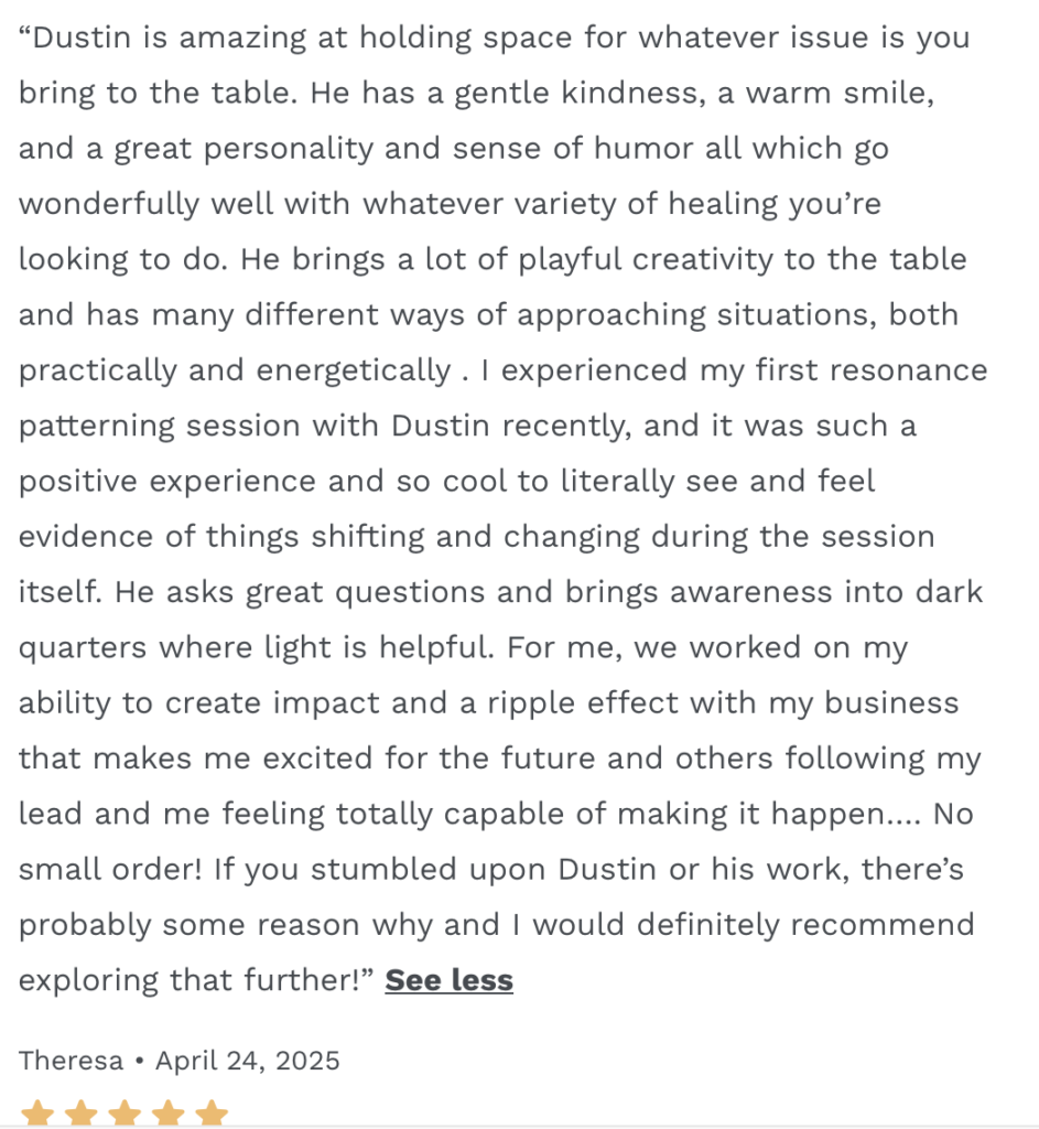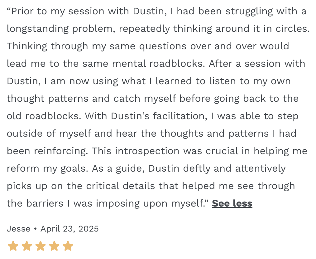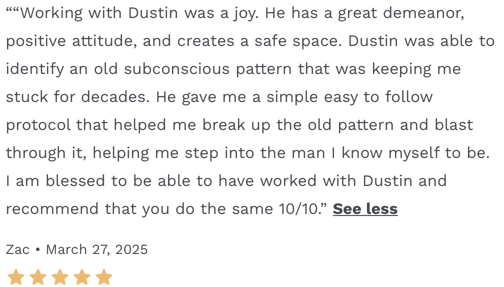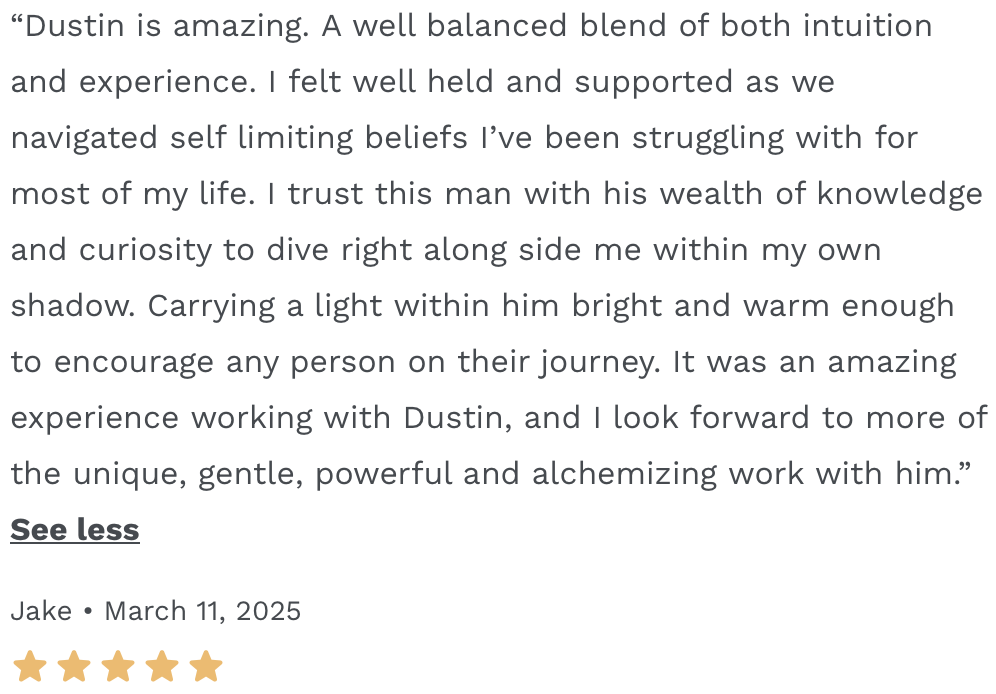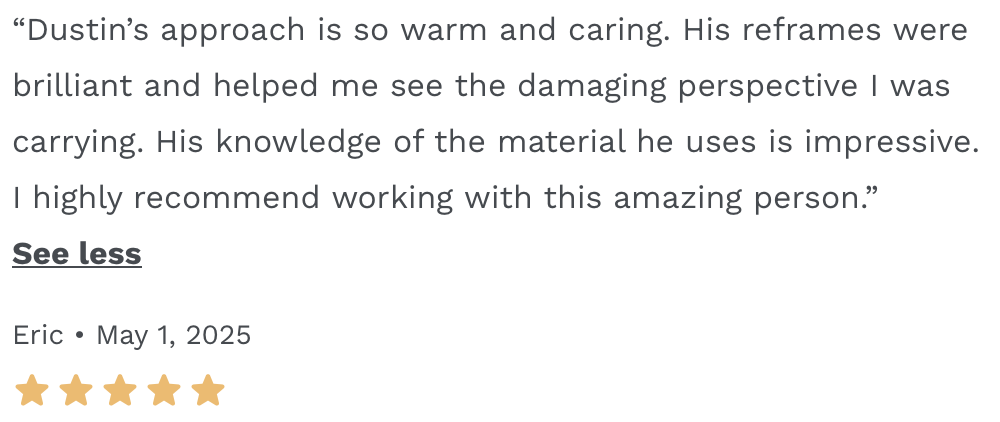 Dustin guided me through a deep and difficult past experience and helped me see it differently. He demonstrates the qualities of lightness, humor, wisdom and inner fortitude. All of which made our session extremely enjoyable and productive.